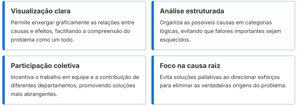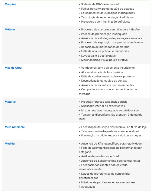 Para facilitar a identificação das causas, o método tradicional utiliza seis categorias principais, conhecidas como os 6Ms: