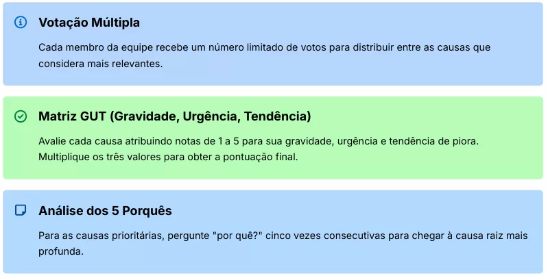 Após o levantamento de todas as possíveis causas, a equipe deve analisar cada uma delas e priorizar aquelas com maior impacto potencial no problema. Algumas técnicas que podem auxiliar nesta etapa: